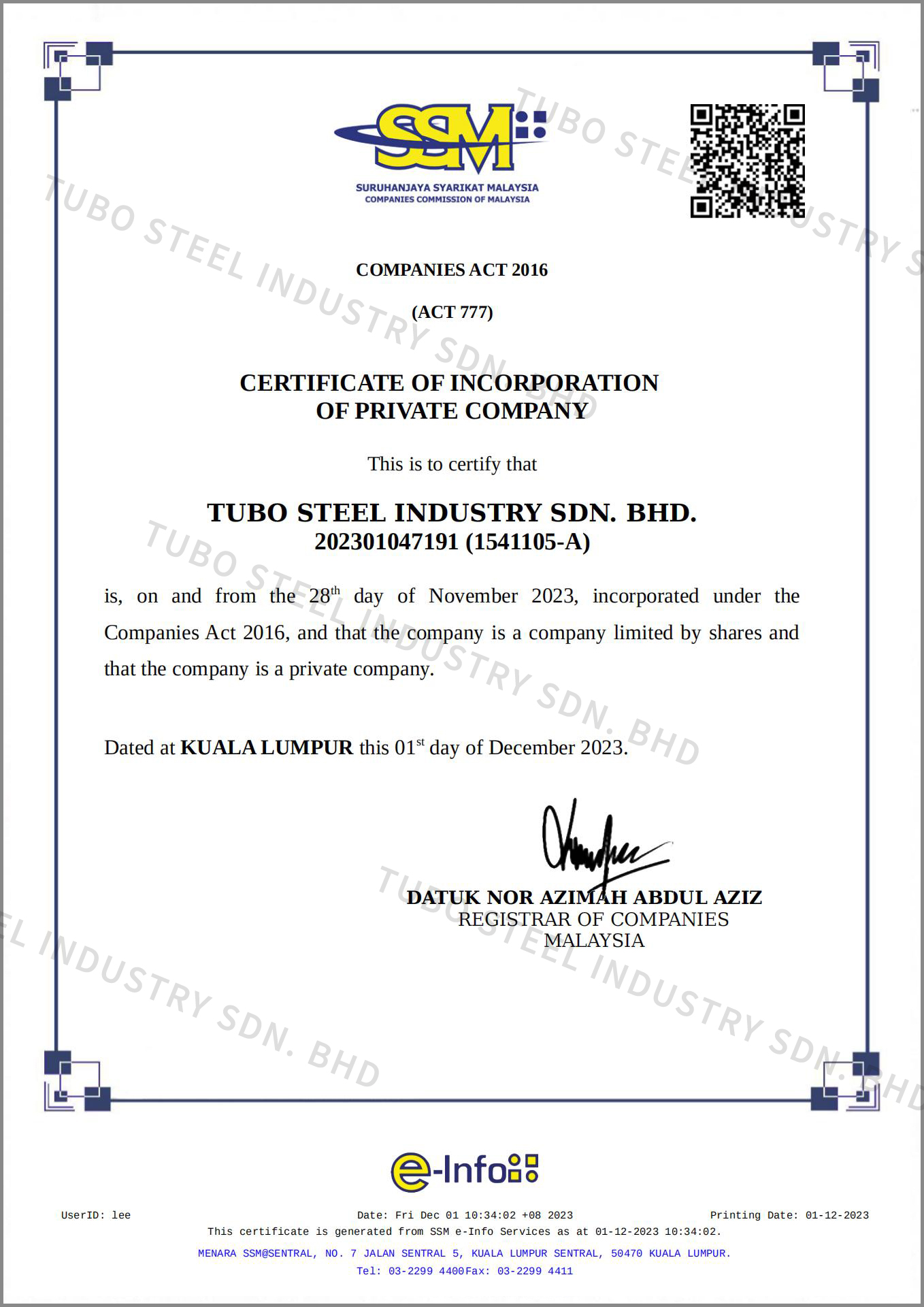 Tubo Steel Industry Sdn. Bhd was founded in year 2023, as a leading manufacturer of carbon steel seamless pipes, located in Klang, Malaysia. We specialize in the production and sales of hot-rolled seamless steel pipes. We are committed to provide high-quality and reliable products to meet the needs of customers in different fields.Our production base is located in Klang, Malaysia, a geographically advantageous region that provides us with convenient logistics and transportation conditions, allowed us to meet customer needs in a timely and efficient manner.